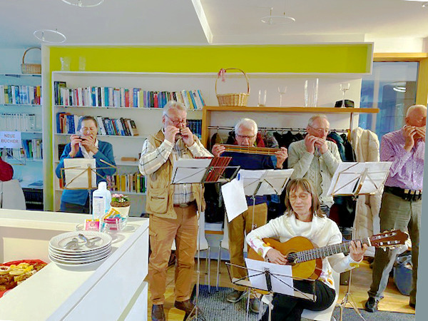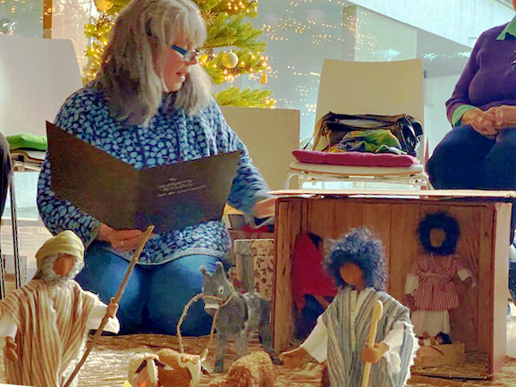 Cécile Rieseberg liest die Weihnachtsgeschichte und wird musikalisch begleitet von Martha Hofner, Renate Lindovsky und ihrem Mundharmonikaclub Oberbayern.